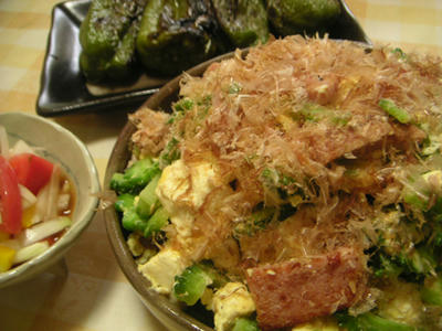 ゴーヤーチャンプルーとか、トマトとパプリカのマリネとか、