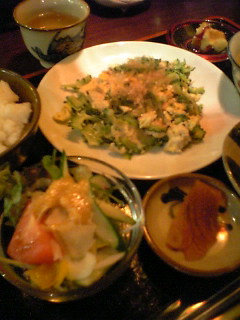 ゴーヤチャンプルーメインで,ヘチマの煮たのんと,ゴボウのスープ,パパイヤの漬物,