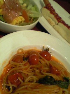 トマト&バジルのスパゲティに、チョリソー、そしてグリーンサラダ。